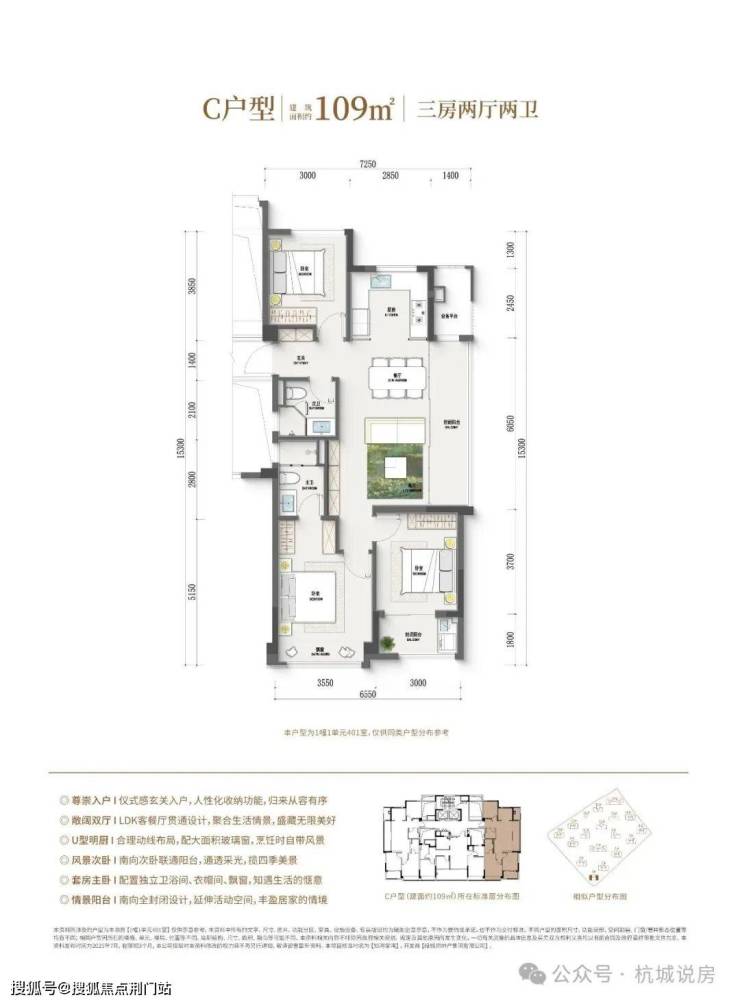 109方户型:三房两厅两卫,独立玄关,横厅边套,生活阳台+休闲阳台(全包),近13米采光