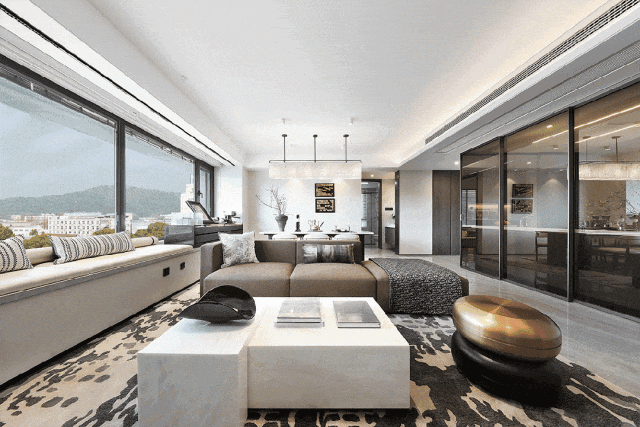 从玄关进入,一眼即是震撼的超大公区:约6.1米的大飘窗拉通整个大方厅,气场十足。