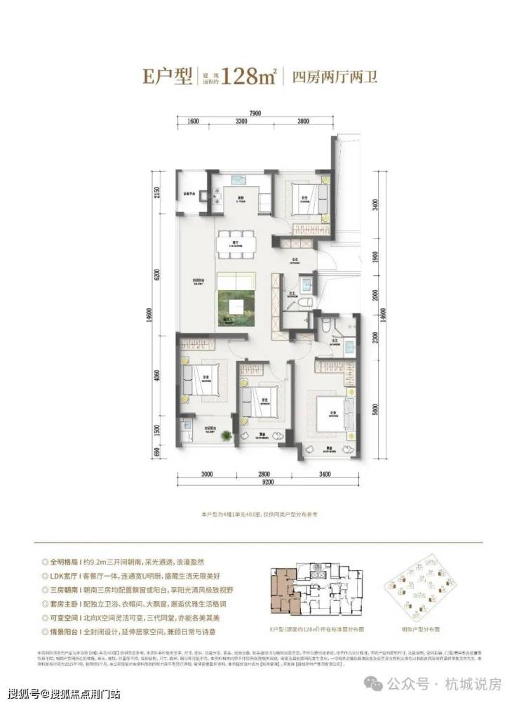 128方户型:四房两厅两卫,独立玄关,横厅边套,三卧朝南,生活阳台+休闲阳台(全包),近16米采光面