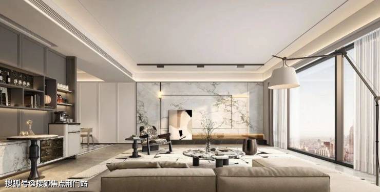 公共建筑的设计手法,通过大面积幕墙窗体系替代传统住宅的立面。蓝灰色玻璃幕横向辅以金色线条,勾勒出现代艺术感的流线立面。这种设计不仅让建筑外观更具现代质感,更重要的是将每户采光面较传统住宅提升了约30%,在确保私密性的同时,实现了‘引光入室’的居住体验。这种处理方式既符合规划对区域城市风貌的管理要求,也让住宅突破了传统采光局限,实现了美学价值与功能升级的双重突破。