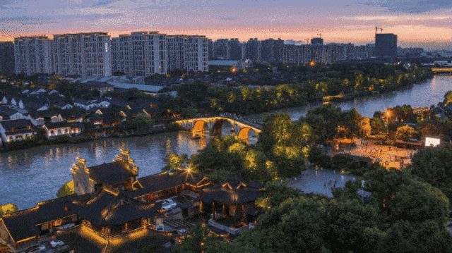 这是以运河边的古戏台遗存“荣华戏园”为蓝本,传统建筑造型搭配金属线条、挂落格栅,现代美感和中华韵味相得益彰。