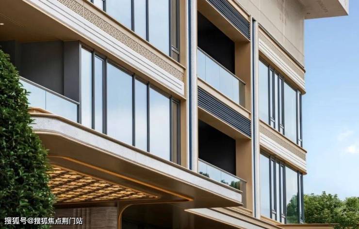建筑立面采用香槟金铝板配合大面玻璃,细部使用美国灰麻石材,辅以精致金属线条,钢琴漆工艺波浪铝板,一看就很贵气,很有辨识度。