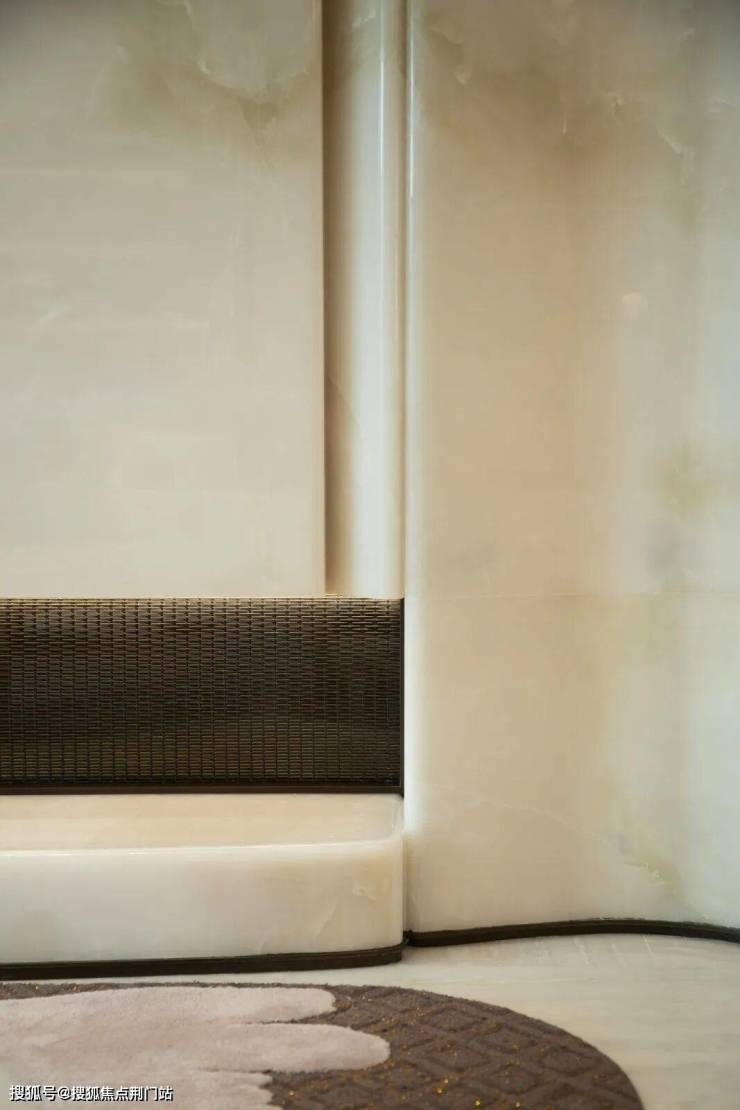 均价3000万的揽奥800同款的风格,电视背景墙采用揽奥800方同款的青玉,地面是四种奢石水刀拼花。