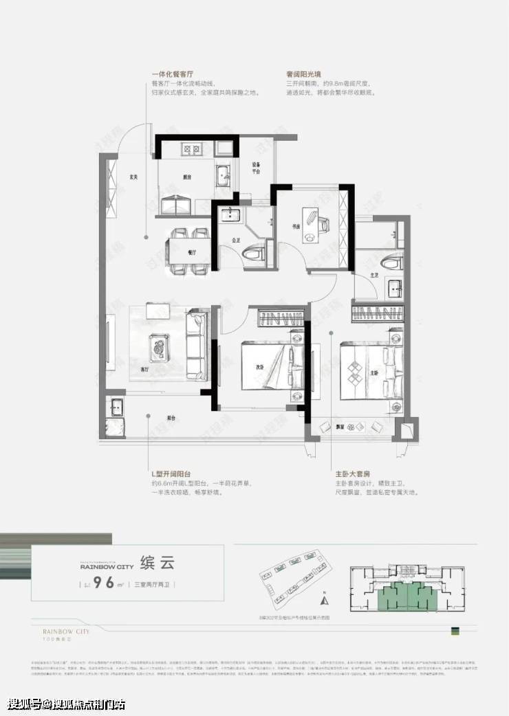 像建面约96㎡户型,整体三开间朝南设计,约9.8m奢阔尺度,户型方正大气,明亮通透,动静分区,再加上约6.6米开阔L型阳台,轻松实现一半洗衣晾晒、一般诗意生活的美妙画境。