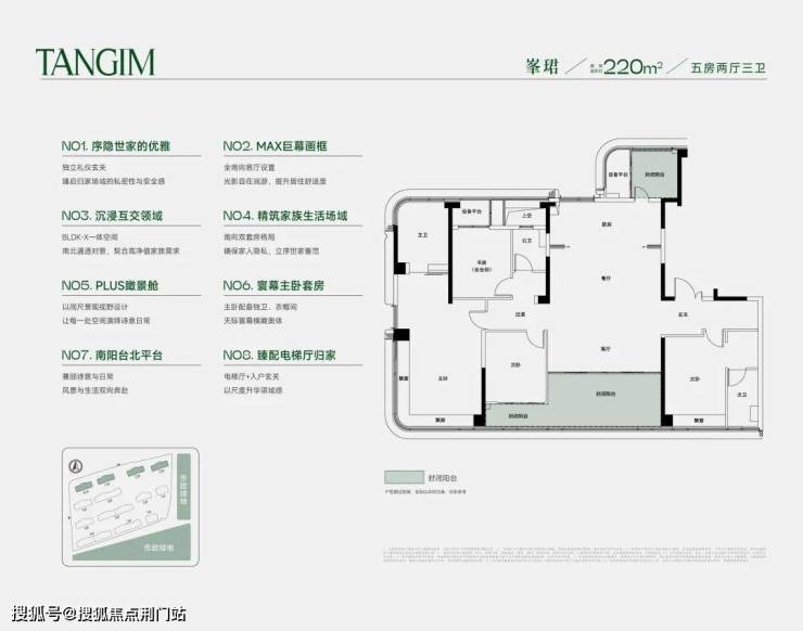 因为天珺是建筑新规后的作品,所以在飘窗,阳台,设备平台等方面有了更大的空间,也得到了更高得房率,像建面约220㎡的高层,得房率就接近92%。所有户型都是南厅设计。
