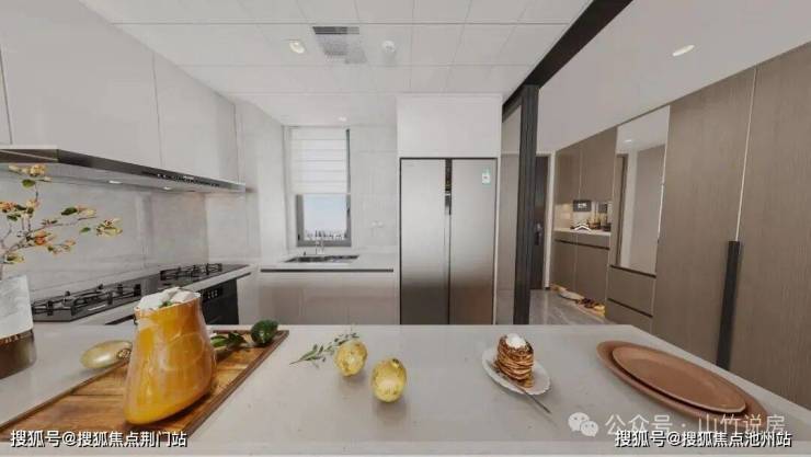 传统户型设计中,厨房往往较为封闭,忽视了当代家庭对社交、互动的需求。荷语江山府 143㎡奢阔户型,采用半开放式岛台厨房设计, 可通过 玻璃移门控制开合,打开门可随时与在客厅的家人互动,关上门则有效隔绝油烟。