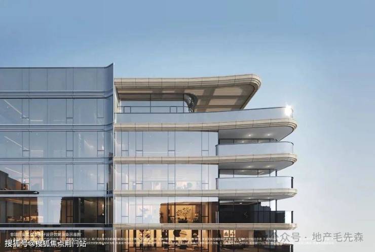 南北两侧立面均是超高的窗墙比,并配以大面落地玻璃。层间线条则是铝材和石材的点缀结合,使用了大量的曲面弧形石材。用的还是跟合肥招商玺同款的「双曲倒弧工艺」,成本非常高。