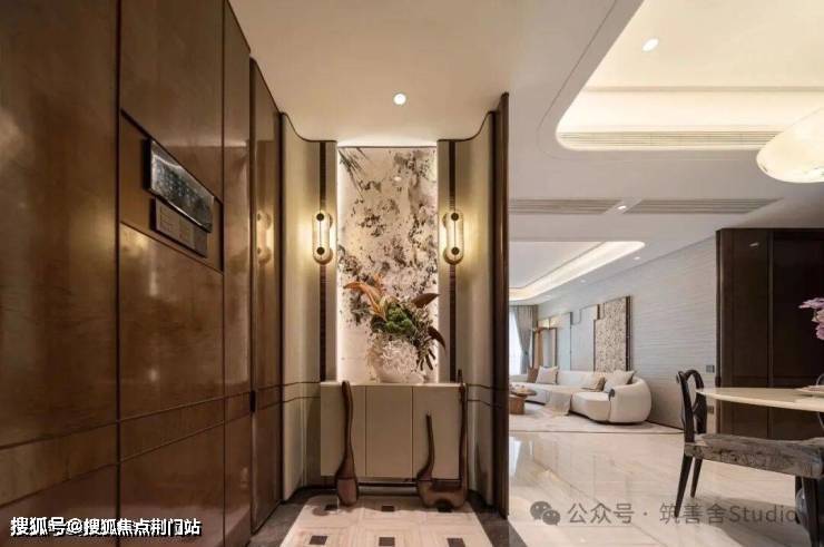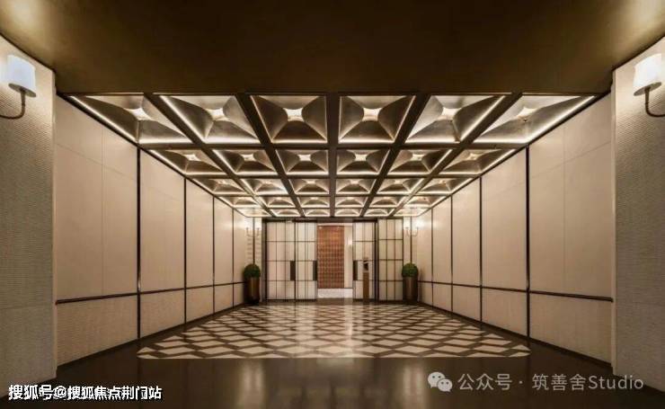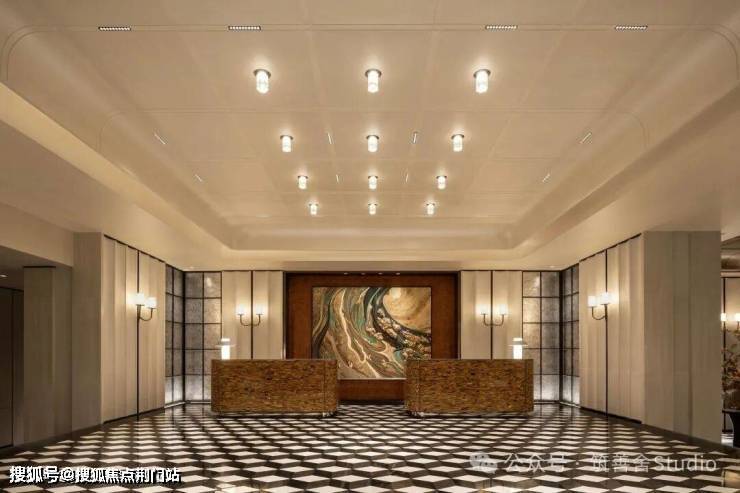 步入大门云石穹顶之下,匠心复刻古代“藻井”神韵,以522片皇家白玉精雕细琢,汇聚光华,辉映古今。华光流溢处,中心池水托举艺术雕塑,莹润皎洁,宛若稀世珍宝。立面更以铂金钻奢石铺陈,搭配墨绿荷塘月色奢石、安哥拉黑奢石花钵,以及手工锻造的巨幅铜门,于光影交错间流淌温润质感,尽显奢华风范。