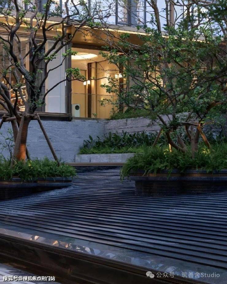 穿过小区大门后,眼前呈现一派绚烂水景,视野豁然开朗:五株婀娜香橼树在花坛中随风轻摆;叠层水幕沿着碧潭金沙、蓝眼睛花岗岩台阶潺潺流淌,营造出宁静祥和的归家心境。