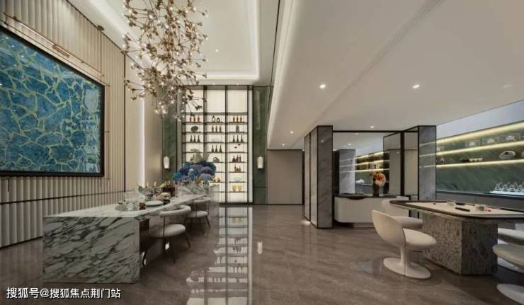 从当代艺术馆到板块唯一的国标恒温泳池、健身房、瑜伽室,溪映听庐的听庐雅舍使用了大量的玉石和金属,雅奢的质感拉满。