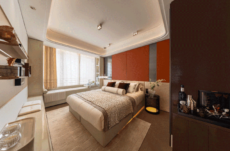 137㎡户型仅主卧与主卫的采光面就达到了约12.7米,主卧配备了270°转角飘窗,将自然光与视野极大化引入室内,形成可休憩、观景与阅读的复合功能角落。