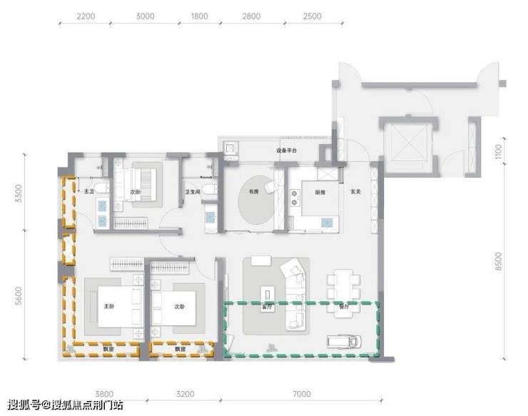 138㎡边套户型,边厅与主卧的连续飘窗总长近12米,南向三个卧室的采光面总长约10米,与137㎡边套一样,都是名副其实的“光之屋”。
