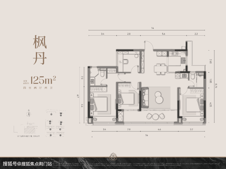 以约125平方米的四房户型为例,餐厅、客厅、阳台乃至玄关都被纳入了一体化设计,开间尺度极其出色。