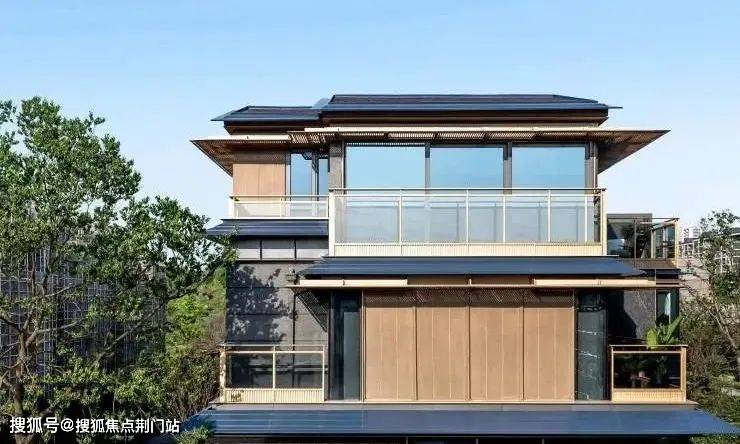 在立面打造上,提取宋代歇山顶样式,转译形成深远的挑檐,整体呈现一种清雅内敛的当代气质;大尺度巨幕玻璃窗镶嵌金色铝线条,极简化打造光影天幕,倒映自然之境;臻选靛蓝色的陶瓦,原创蓝金坡屋顶,掀起杭州合院立面的新序章。