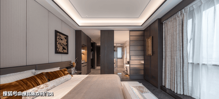其中,主卧不仅自带270°转角窗,还设计了“洄游式”动线:开放式的梳妆区串联休息区和衣帽间,完成场景的无缝转换。