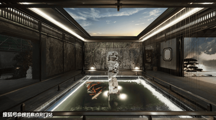 下沉式庭院中,有假山叠石、瀑布水帘,美轮美奂,氤氲着豪宅的府邸气象