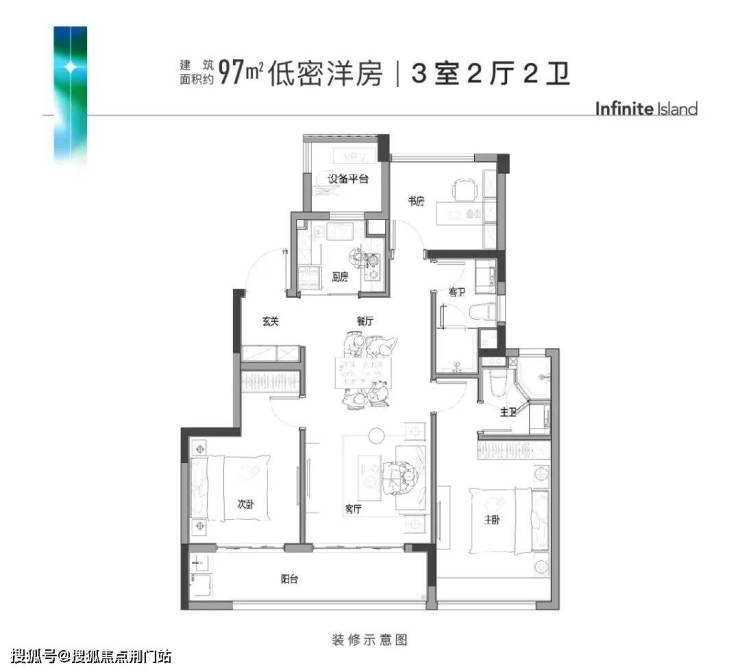 这么一来,户型的格局也就打开了。比如建面约97㎡三房两卫,就是三开间南的“三叶草”,室内无过道浪费,还带约6.4米宽景双阳台。