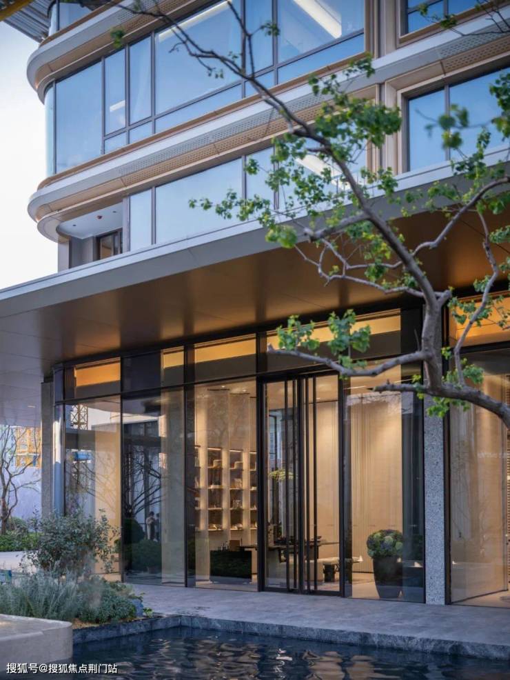 玉湖之星传承千年的玉润文脉,在材料动用上,突出玉、白、润、贵的格调,从钟鸣显赫的主入口,到泛会所、下沉式庭院、背景墙,大量选用贝金米黄石材、海浪灰花岗岩、水纹玻璃等景观材料,而且用了大量复杂的弧形和拉槽工艺,和立面相呼应。