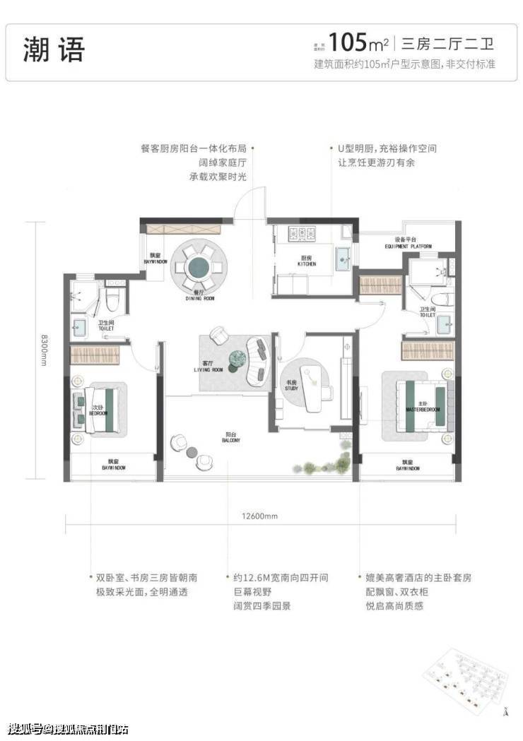 首先,项目的户型起步就是四开间朝南的建面约105方三房