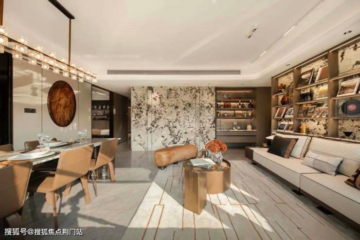 比如它的单元大堂,地面不是简单通铺,而是用上了定制波浪纹地砖,再用弧形金属波打线收边,质感特别高级。