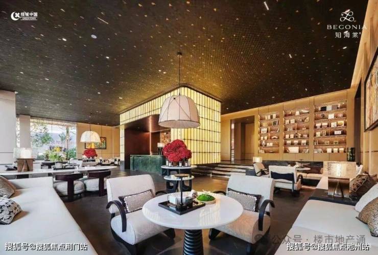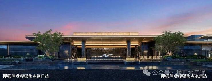 通过门廊,采用透光吊顶,通透感更强,来到归家大堂,落地玻璃外就是大片水系