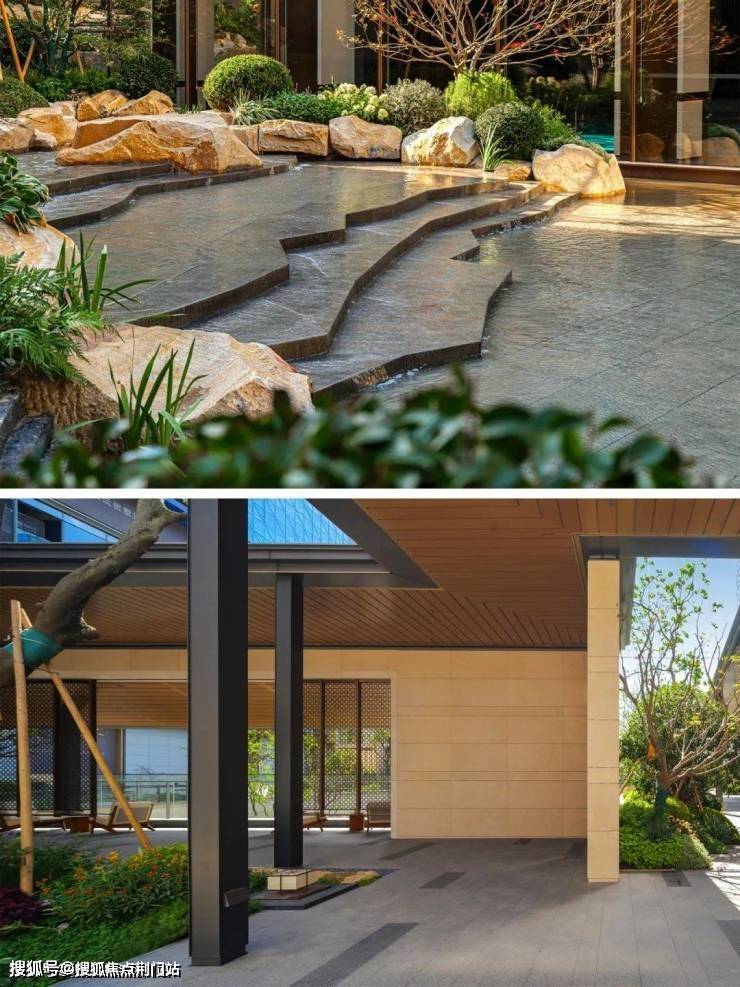 除了得房率出众,项目也有不少地方可圈可点。打造了宽约43.8米大门,四面铝板+大面积玻璃的公建化立面,高窗墙比,看起来很养眼。公区还设计了下沉式庭院、恒温泳池,高层全区覆盖了风雨连廊。