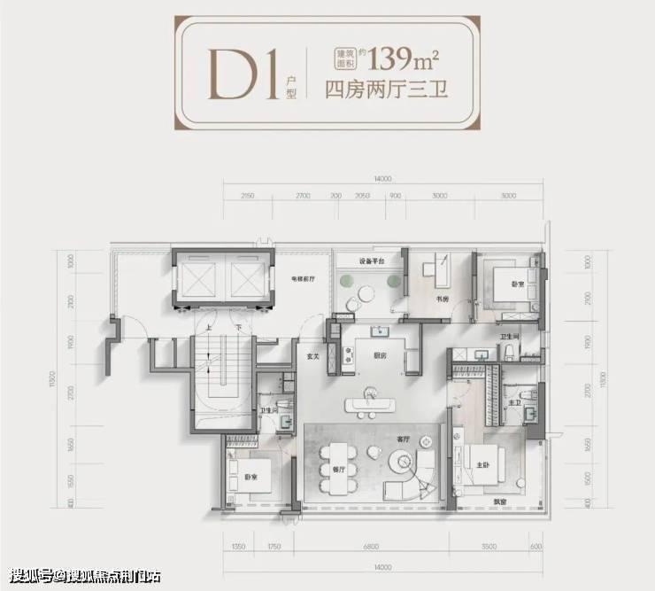 139平方米设计成四房三卫,大横厅,南向开间做到14米,两个卧室都带独立卫生间,这个比较少见,主卧还做了子母门。
