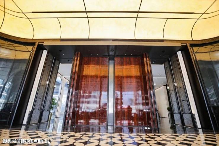 约百米的入口展示面用大面积香槟金铝板搭配深灰色铝板吊顶,立柱同样是熠熠生辉的铂金钻满铺,质感拉满;辅以高透超白夹胶玻璃,并采用了大面积弧形工艺。当华灯初上,金顶垂云,光影跃动,用璀璨奢华来形容丝毫不为过。目之所及,皆是精工细琢和高价材质,一一构建起礼序自彰的赫赫门庭。