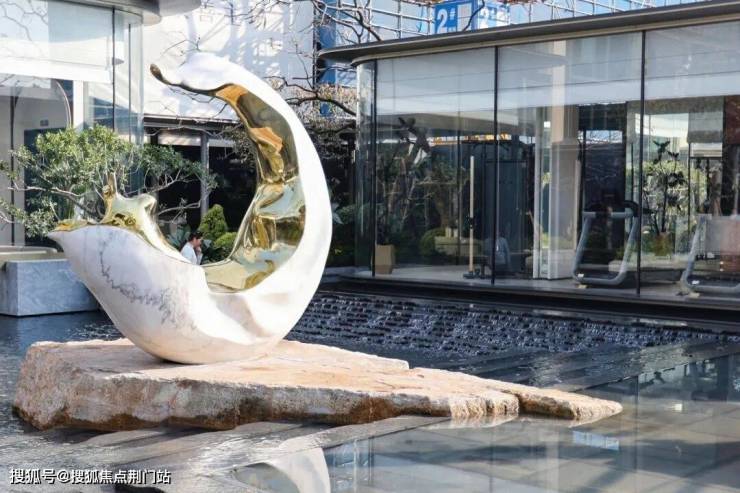 首入示范区,是约40米宽的地标级华盖门庭,犹如一座恢弘的艺术馆入口,以超长尺度,启幕归家的序曲。此外,大门在造型、选材和工艺上同样可圈可点。大门景墙汲取“行舟潮起”的灵感,打造媲美星级酒店的落客区。由铂金钻奢石密拼铺装的景墙,与中岛区价值不菲的全冠植栽的黑松迎接着访客,给人第一眼的惊艳。