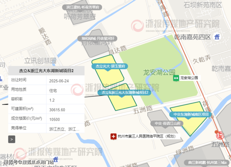 2025年6月24日,浙江杰立房地产开发有限公司、杭州承弘置业有限公司(浙江杰立&浙江光大建设集团)以总价32147万元竞得五洲路与顺意路交汇西北地块,成交楼面价为10500元/㎡,溢价率为0.0%。