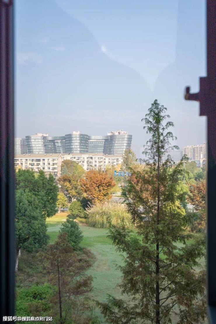 北房间的落地玻璃,窗外秋黄的风景更加壮观,像是一幅巨画,甚至不远处还能看到西湖群山山脉(高楼层会更明显)。