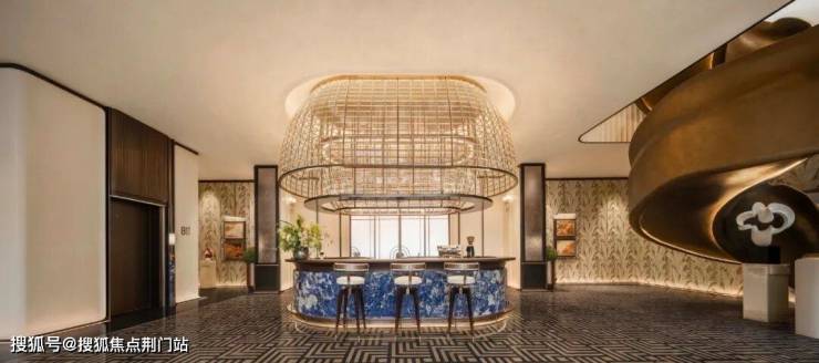 会所装修上,同样采用了大量的奢石。圆形岛台采用玻利维亚蓝,造价约60万;顶部水晶灯,是为浩运府定制款,每一块都要根据结构定制弧面,造价约50万;艺术楼梯造价约200万。