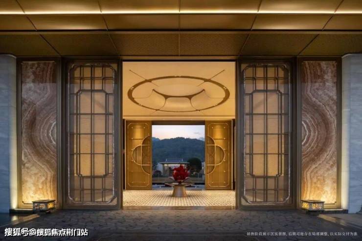 拾级而上,层高约5.7米的入户大堂,远眺框景石岩山入画,近瞰「月映泉台」的下沉式庭院,金舟载玉的雕塑,如一叶扁舟缓缓驶入画中,道法自然山水。
