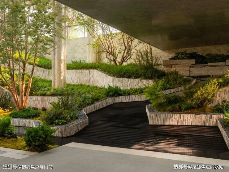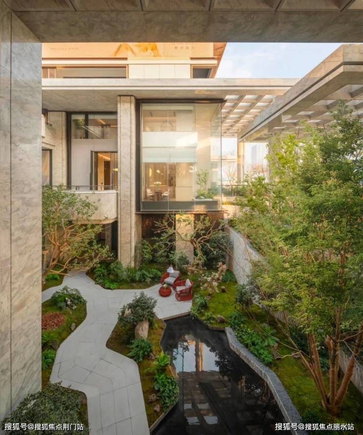 在这个立体悬浮世界里,有着天台层、归家层和下沉庭院层的垂直景观布局。从穿长廊的登高望远、到见溪潭、叠流韵的曲水流觞,再到揽河景、探幽境的探幽寻密。