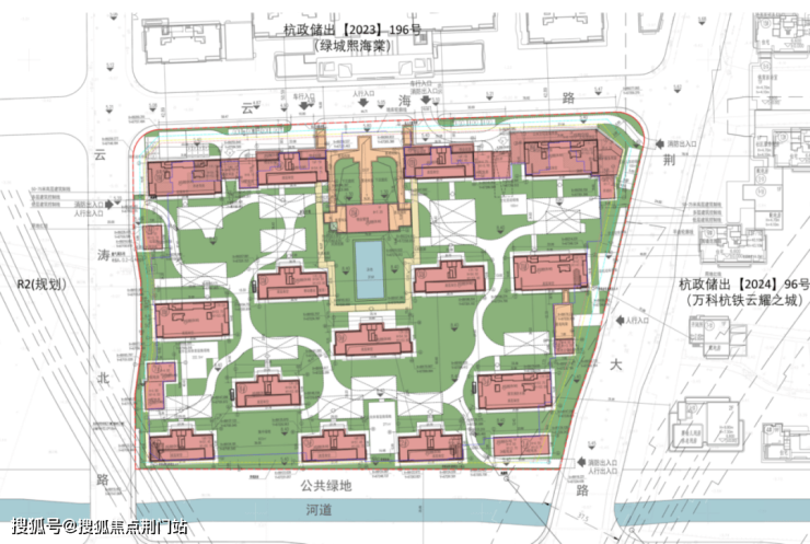 项目北面是绿城熙海棠,东面云万科云耀之城,南面是公共绿地、河道,居住氛围十分不错。主要的出入口也位于北、东两侧。
