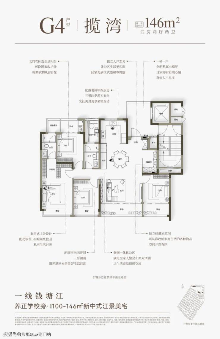 建面约146方则分为横竖两款,全部一线朝江。两梯两户,都有独立电梯厅。“横版”是四开间朝南+大方厅,“竖版”有大边厅+超长转角飘窗的“全景舱主卧”。
