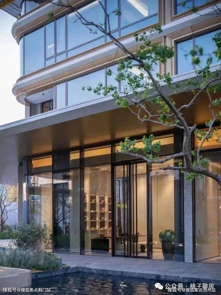 玉湖之星传承千年的玉润文脉,在材料动用上,突出玉、白、润、贵的格调,从钟鸣显赫的主入口,到泛会所、下沉式庭院、背景墙,大量选用贝金米黄石材、海浪灰花岗岩、水纹玻璃等景观材料,而且用了大量复杂的弧形和拉槽工艺,和立面相呼应。