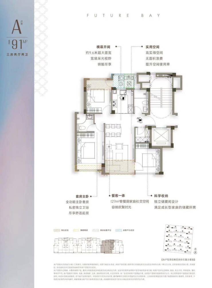至于户型,小高层有建面约91-108-125-139-165方,5种不同面积段的设计。得房率最高达95%。