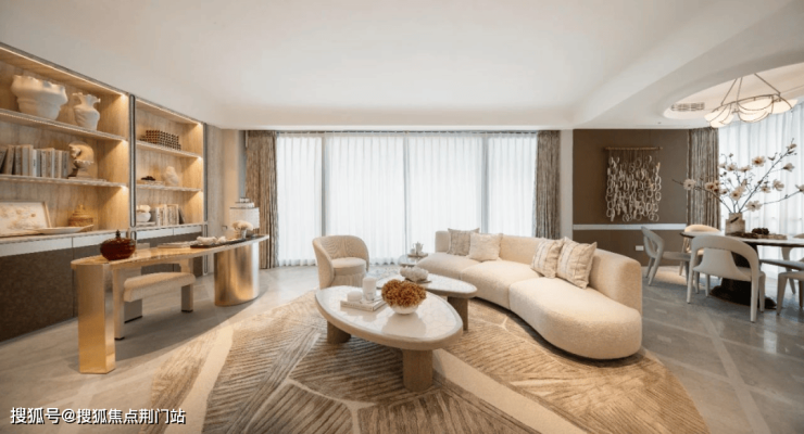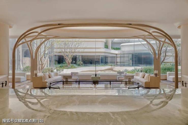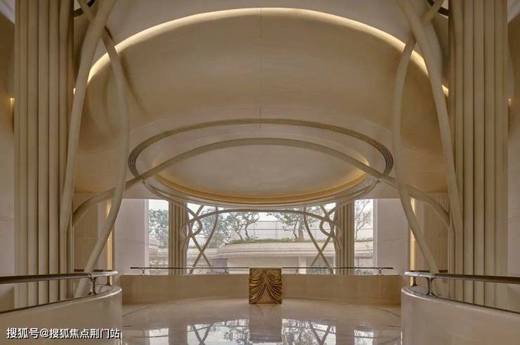 大门内外两重门厅景墙运用月光米黄石材近1000 方,搭配香槟金金属线条,汲取爱马仕全球旗舰店的双曲面叠墙造景手法,增加景墙奢华质感。 项目沿河的楼幢整体上抬,也就是——抬地式。好处在于地库通风,客户行车归家动线更合理。