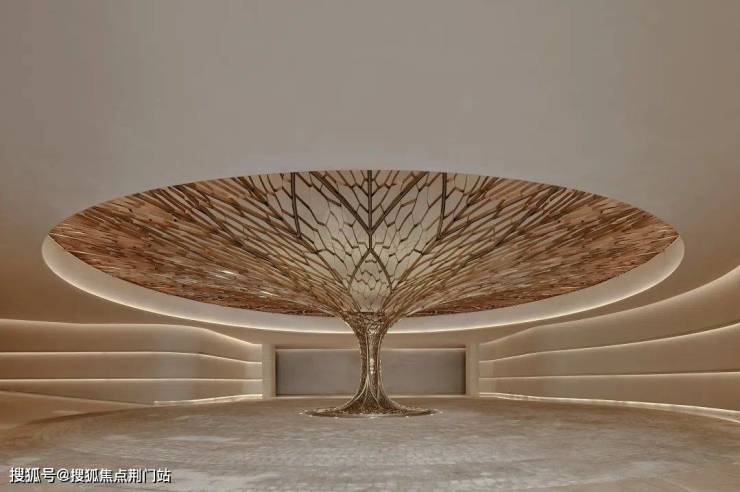大堂「生机之亭」高约15米,凌空矗立为归家动线的核心枢纽。藤蔓枝干与天花交织缠绕,地面与顶面纹理呼应,共织以森林韵律为魂的生态栖居归家仪式。