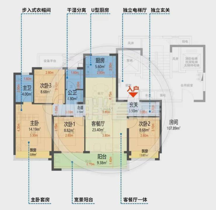 2.全四房户型。最小户型107㎡都做了四房两卫+独立储藏间。
