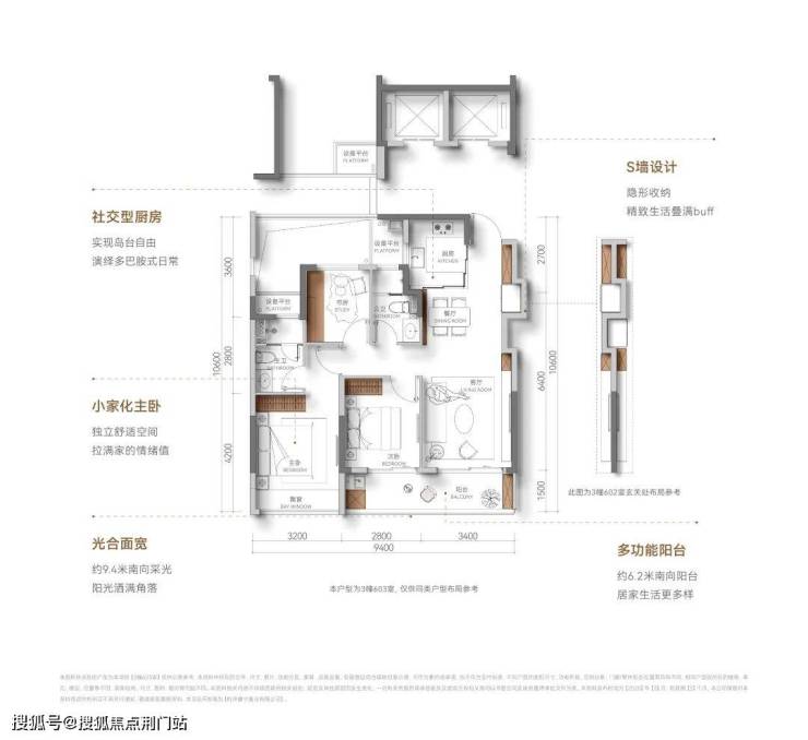户型方正,没什么浪费面积,虽然是中间套设计,但做到了全明户型,通风效果好;南向三开间,双联阳台+飘窗,南向采光充足,阳光满堂;超配S墙,隐藏收纳柜,让小家越住越大,可以说杭州少见。