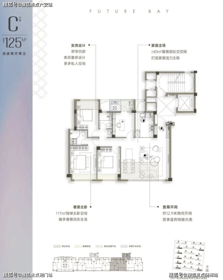 建面约125㎡户型:四房两厅两卫:南北通透,类“一户一梯”设计,增强了归属感与私密性,入户空间可安置童车、鞋柜等。该户型是小面积真边套四房,卧室面宽尺度优越,四开间朝南,约12.9米南向面宽,南向大横厅开间约6.4米,餐客厅面积约40㎡。