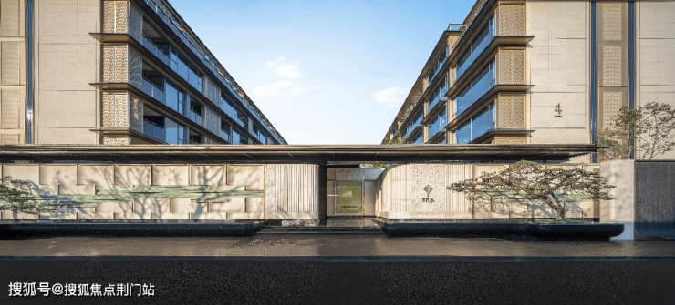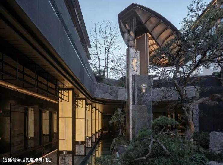 主入口横向延展面达90M,门头采用庑殿形制,以大规格金色金属对称式屋顶,强化归家礼序,立面以透光碧玉奢石呼应“天青”之美,结合星空闪耀的流水景墙,打造“光之水韵”,共同还原古运河形态。