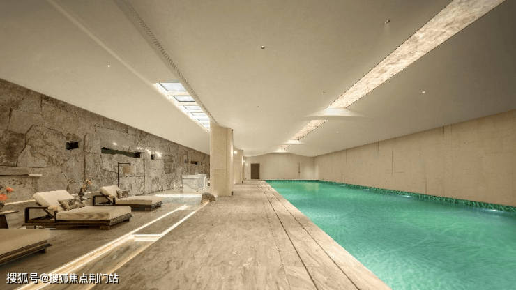 运河樾的恒温泳池,也是杭州首个“夜光泳池”,300多方海浪绿石材铺就的池壁及步道,荷叶状拼花的马赛克;