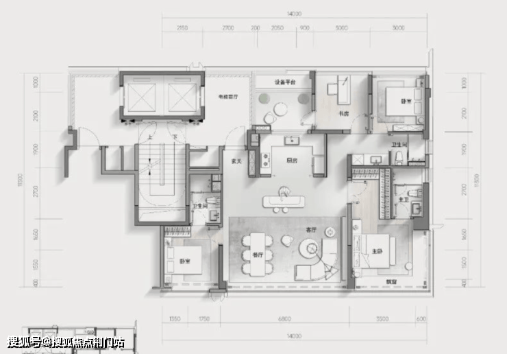 特别值得一提的是,户型设有独立电梯前厅,具备一定的私密性和收纳空间,电梯厅、设备阳台与书房互通,在可改性上也留有空间想象力。