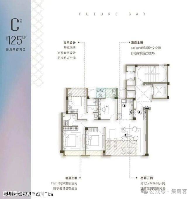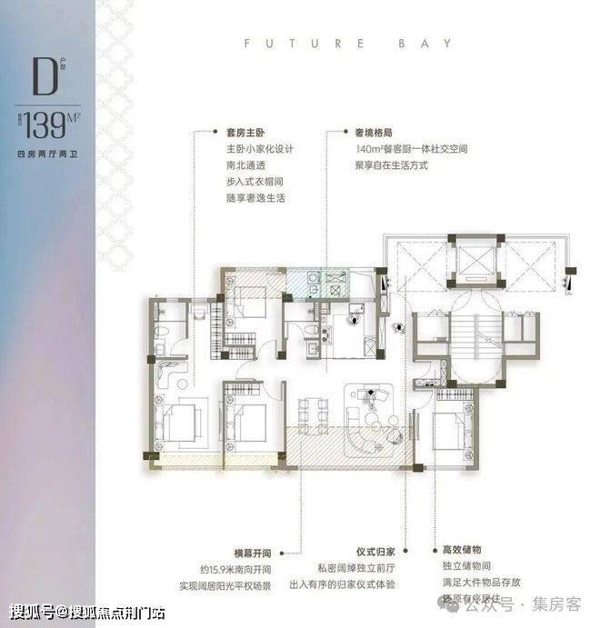 约139方户型,4.5开间朝南+储藏间,南向15.9米超大采光面,做到五开间朝南的空间,标配储藏间,三个南向卧室设计。