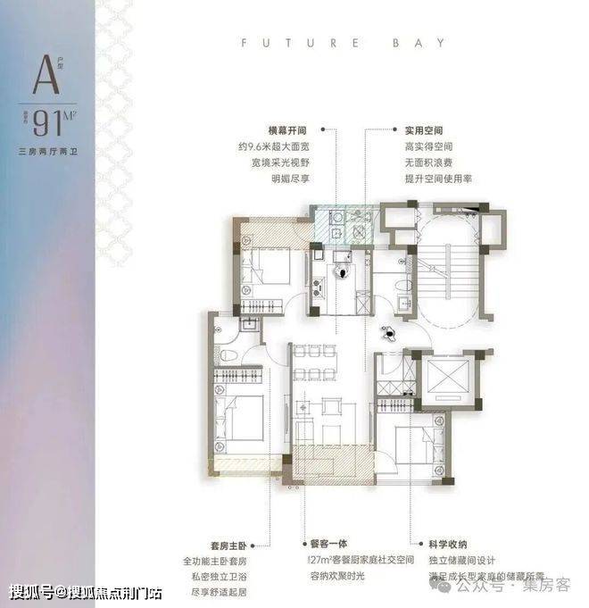 建面约91方真三房户型,真南北通透洋房产品北侧无消防连廊设计,小面积也是真南北通透,区别市面2+ 1户型,最小的卧室也有将近9个平方,每个卧室面宽均达到3米及以上