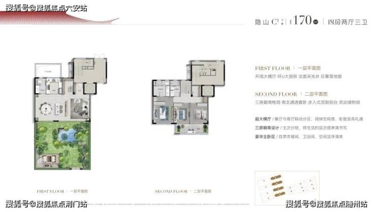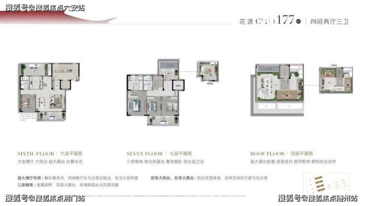 约177㎡上叠,不仅具有下叠四房朝南和大横厅的优势,而且每层都有南北双露台(阳台);