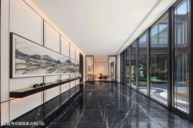 从当代艺术馆到板块唯一的国标恒温泳池、健身房、瑜伽室,溪映听庐的听庐雅舍使用了大量的玉石和金属,雅奢的质感拉满。